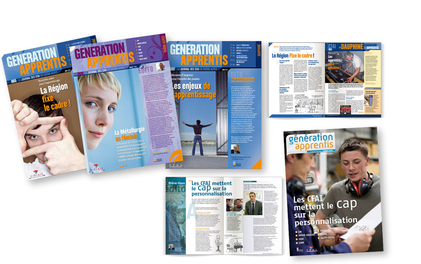 Édité par Format et diffusé par le CFAI (Centre de Formation des Apprentis de l’Industrie) de Rhône Alpes, ce journal semestriel est distribué à tous les partenaires industriels et institutionnels concernés par l’apprentissage. En collaboration avec Bénédicte Magne de Format qui s'occupait de l'ensemble de la rédaction, mon travail a consisté à créer une maquette, une têtière, une grille de mise en page dédiée à ce journal. Une première maquette de 2006 à 2010, puis un renouvellement d’image en 2010.